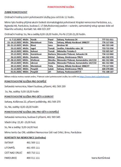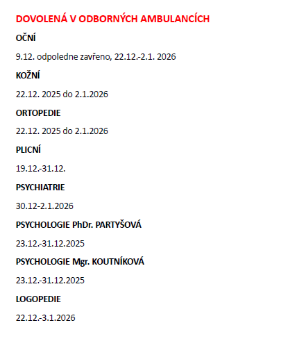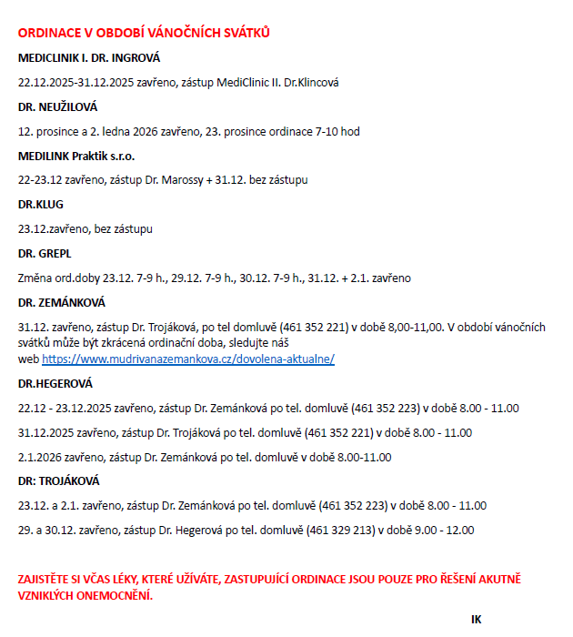 Úvod > Obec > Aktuality > Změny ordinací a pohotovostní služba - prosinec 2025